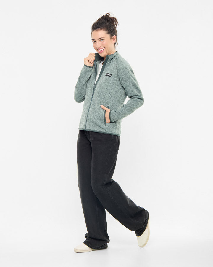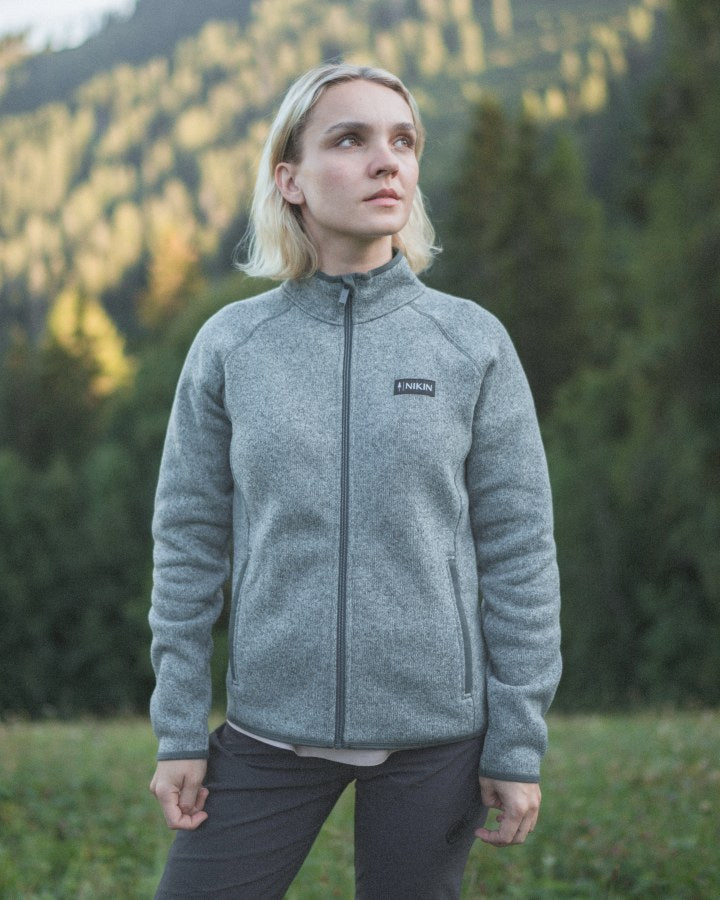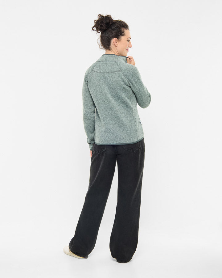 The TreeJacket Knitted Fleece Women combines warmth and comfort with a feminine, tailored cut. The recycled polar fleece material with a knitted look on the outside and soft, roughened inside ensures pleasant insulation and a cozy feel. Two practical zipped side pockets offer secure storage space, while the collar with organic cotton lining provides additional comfort. A sustainable everyday companion that reliably keeps you warm.