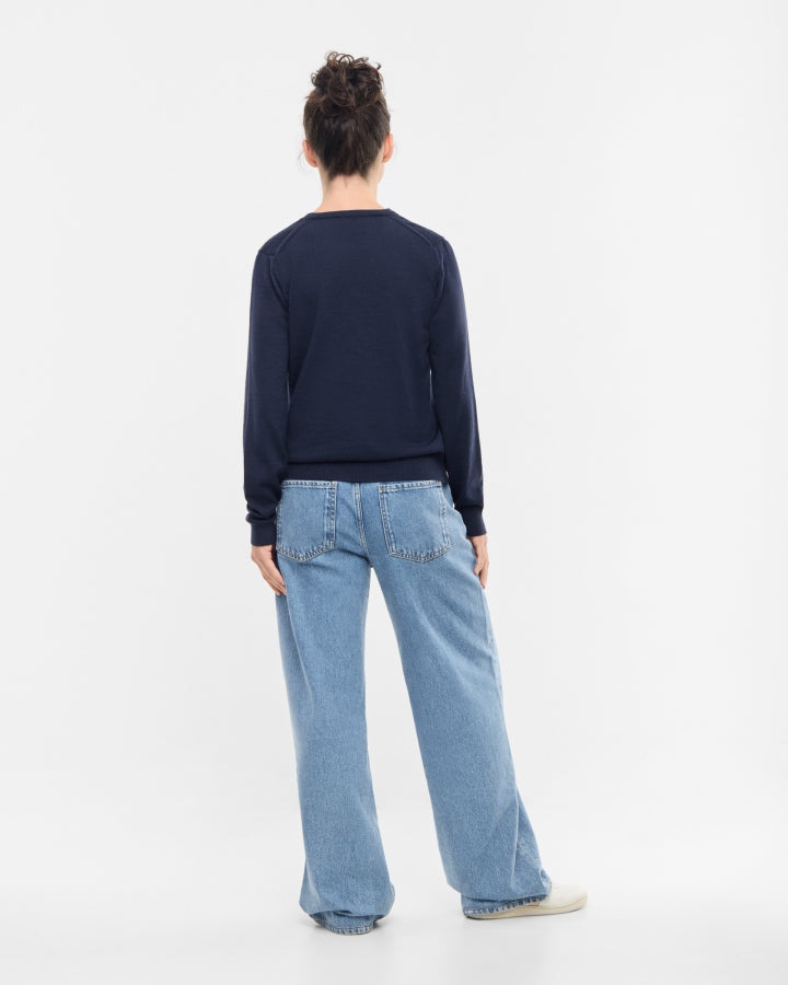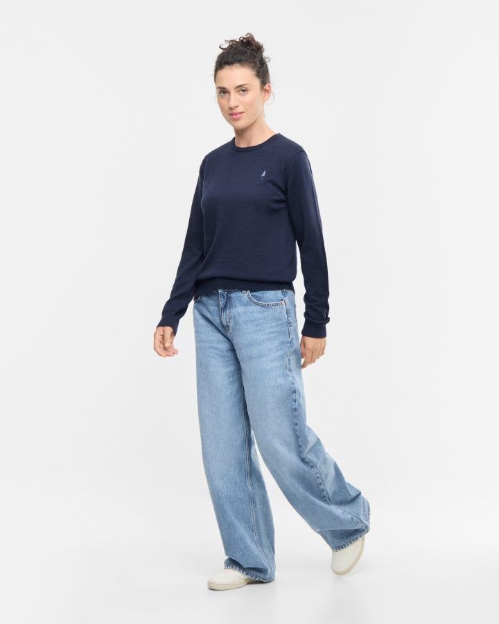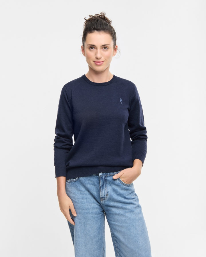 The TreePullover Merino Wool Women in Dark Navy is an elegant wool pullover that impresses with its functionality and sustainability. Made from high-quality merino wool, it keeps you pleasantly warm, regulates odors and is particularly easy to care for - frequent washing is not necessary thanks to the natural properties of the wool. Thanks to the pre-washed finish, the merino pullover fits comfortably right from the start and retains its shape. The fine tree embroidery and classic cut make it a timeless piece for everyday wear and leisure.